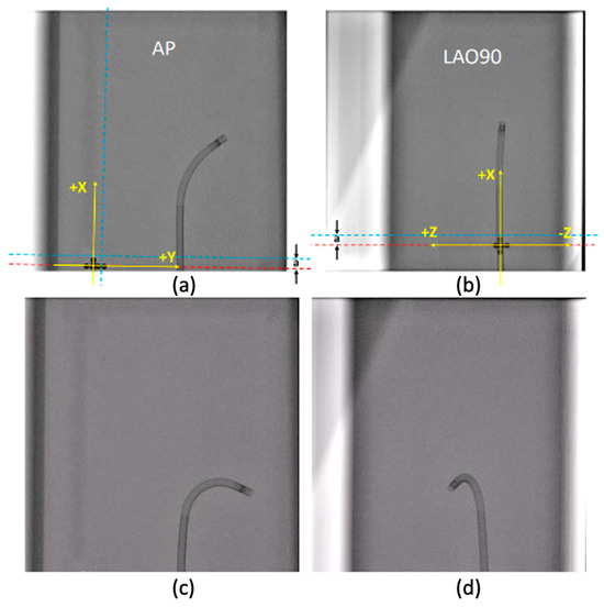 (a,b) The X and Y axes (yellow), entering edge (red dotted line), and crop area (blue dotted line) specified in LAO90 and AP views; “a” represents the distance between the entering edge and crop area, where a > 1.5D, with D being equal to the sphere’s diameter; (c,d) two paired fluoroscopic samples of the 529-sample set, AP (c) and LAO90 (d), after preprocessing.