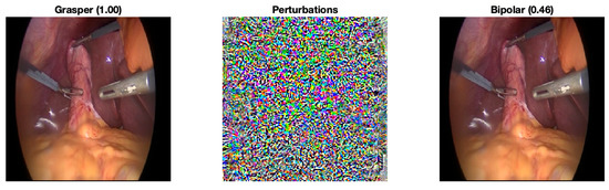 Modify an image from Grasper (class 1) to Bipolar (class 2) with the fast gradient sign method (FGSM). The adversary (right) with minimal perturbation was generated exactly when the classification changed.