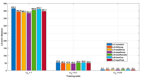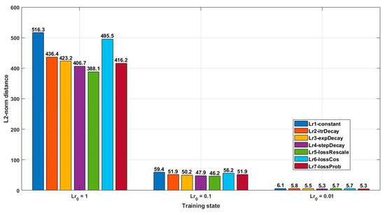Figure 5 shows the shortest perturbation to find the target adversaries. The mean L2-norm distances were calculated based only on the successfully generated adversaries. When the initial learning rate is 1 and 0.1, the first function (constant) and the sixth (loss trigonometric function) generated larger perturbations than others, and the fifth (loss rescale function) showed the fewest perturbations. When the initial learning rate is 0.01, the calculation was based only on thirty-seven joint successful cases, as the fourth (step decay) has a relatively low success rate to reach the target within 100 iterations. In this case, perturbations were approximately evenly distributed, indicating that the solution was strongly influenced by image properties (close to the classification boundary) rather than the decay algorithms.