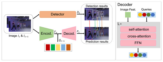 Many modern multiple-object tracking systems follow the tracking-by-detection paradigm, consisting of a detector followed by a method for associating detections into tracks. The displacement of objects of interest provides important cues for object association. Many works have been inspired by tracking objects through motion estimation. SORT [6] uses the Kalman filter [7] as the motion model, which is a recursive Bayes filter that follows a typical predict–update cycle. The Kalman filter’s simplicity and effectiveness make it widely used in tracking algorithms [6,8,9]. But the Kalman filter as a hand-crafted motion model struggles to deal with diverse motion on DanceTrack [10]. OC-SORT [11] pointed out the limitations of SORT [6] from the use of the Kalman filter [7] and improved robustness against occlusion and nonlinear motion. CenterTrack [12] built on the CenterNet [13] detector to learn a 2D offset between two adjacent frames and associate them based on center distance. But CenterTrack [12] has bad association performance. Recently, MOTR [14], which extended DETR [15] and introduced track query to model the tracked instances in the entire video, has shown the potential of the transformer on data association. But MOTR [14] utilizes the same query to implement detection and tracking, resulting in poor detection performance.