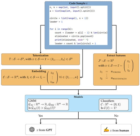 Central to our methodology is a reduction of complexity; the intricate task of differentiating between human- and AI-generated code is represented as a fundamental binary classification problem. Specifically, given a code snippet