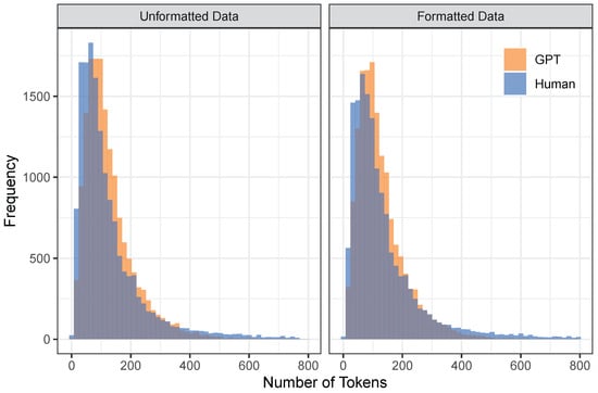 Distribution of the code length (number of tokens according to cl100k_base encoding) across the unformatted and formatted dataset. Values larger than the quantile were removed to avoid a distorted picture.