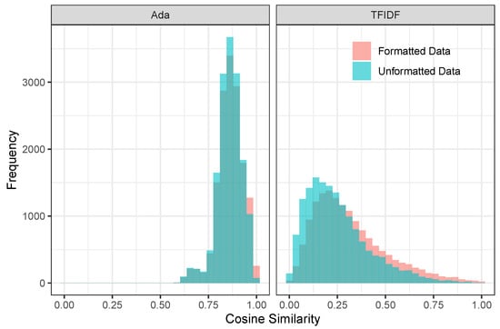 Cosine similarity between all human and GPT code samples embedded using Ada and TFIDF, both formatted and unformatted.