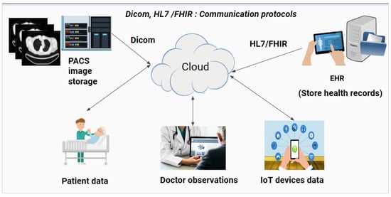To store DICOM images, the Picture Archiving Communication System (PACS) is used to further process the raw data. Patient records are stored in Electronic Health Records (EHR). EHRs communicate with other devices through the High-Level Seven (HL7) and Fast Healthcare Interoperability Resources (FHIR) communication protocols. For other medical devices, which can be either portable, handheld, or hospital-based IoT devices, the cloud-based infrastructure processes them in real time or through batch processing mechanisms. Figure 1 illustrates the main data sources that act as the backbone of a cloud-based healthcare information system and can be utilized for minimizing medical errors.