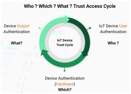 The identity relates to the user component, while the IoT device and network relate to the hardware component. Finally, the application workload and transaction context relate to the output component.