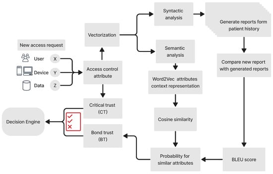 Bond Trust (): When a transaction passes the critical trust assessment, the bond trust is used to evaluate the relationship to other resources in order to build a trust cycle, ensuring that only authorized and highly trusted actors and designated people can access data or resources based on the organizational policy or rules. Calculating bond trust is more complex, and depends on several different aspects. has two main assessment criteria. The first is , which assesses the semantic relationship between each individual attribute stored in the health care information system. The second is , which assesses the syntactic relationship between the set of candidates in a generated health report. The reason for using these two measures is, first, that it is essential for each attribute to have meaning and to be related to similar attributes as compared to the pretrained one; second; it is essential to guarantee that the attributes in the generated report are in keeping with the context of the patient’s history to ensure that the report is highly likely to be related to the same patient, avoiding false diagnoses due to having the wrong case.