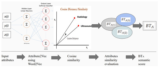 The proposed assessment of uses an Attribute2Vec representation based on a pretrained Word2Vec model [40,41]. Attribute2Vec is used to map the attributes and their synonyms to words that have the same context from the user (x), hardware (y), and output (z) attributes stored in their electronic health records. The skip-gram methodology [42] is used to derive the attributes with the same context; in this framework, we suggest using the first three words with the highest context probability. The advantage of using this assessment technique is to generalize the model by accepting a wide variety of attribute descriptions in a global context. Word2Vec is valid for different languages and dialects; for example, it was used by Altibbi.com [43] to train 1.5 million medical consultation questions in the Arabic language. We recommend using a matching engine on the Vertex AI platform at Google Cloud to ensure that the word embedding and vector similarity matching processes are efficient and reliable.