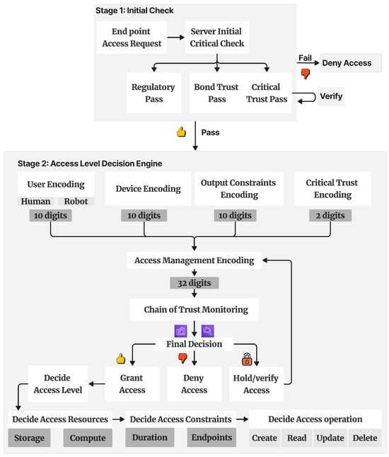 Stage two: The decision engine encodes the attributes from devices, output, users, and critical trust in a 32-digit hexadecimal array. This 32-digit array is then analyzed to make the final decision. The final decision is encoded to resemble the access level, operations, access resources, and constraints; see Section 3.5.