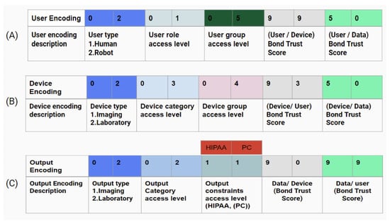 Example of access control encoding: (A) user encoding, (B) device encoding, and (C) output encoding. PC stands for patient consent. The different colors used in the tables are only used for arbitrary categories classes but are not scaled for measurable assessment.