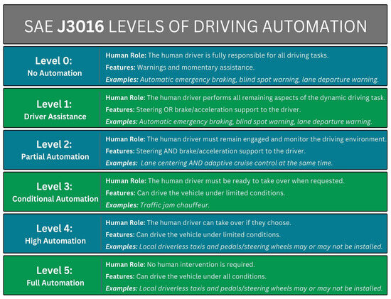 The Society of Automotive Engineers (SAE) International defines six levels of driving automation, from no to full automation, as seen in Figure 1. These levels, updated in 2021, provide a classification based on a vehicle’s level of automation. They are descriptive and technological rather than normative and legal. No automation is at level 0; human drivers carry out all driving duties. Level 1, or driver assistance, entails the vehicle performing accelerating and braking or steering actions following the driving conditions while the driver assumes all other driving duties. In partial automation, also known as level 2, the vehicle manages steering, acceleration, and deceleration while relying on human intervention for the remaining functions. Level 3, conditional automation, allows the vehicle to drive itself in some situations but still needs human assistance when needed. When a vehicle reaches high automation at level 4, it can manage all driving duties under specific circumstances, even if a human driver does not react to a request for assistance. And last, level 5, or full automation, denotes a car’s capacity to operate in every driving situation without human intervention [16].