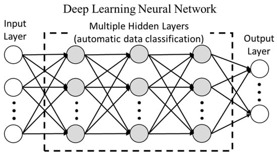 An artificial neural network (ANN) consists of a set of basic processing units called artificial neurons (Figure 1a) [43]. For an ANN, the connection of multiple neurons allows it to solve complex problems, which can be defined as linearly non-separable or nonlinear problems [44]. An arrangement of neurons in a reduced number of layers enables the solution of many problems only if the input data are properly categorized (Figure 1b), conversely, a drastic increase in the number of hidden layers helps to automatically resolve the classification of the data (Figure 2) [45]. This last type of ANN has proven to model high-level abstractions by applying multiple non-linear transformations.