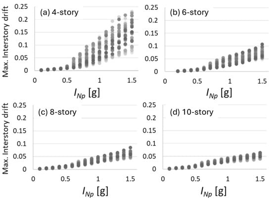 Maximum interstory drift using the spectral shape INp for mid-rise buildings with (a) 4 stories; (b) 6 stories; (c) 8 stories; (d) 10 stories.