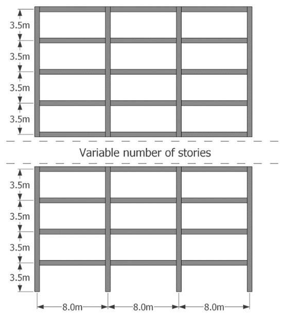 To generate an acceptable prediction model, it is necessary to have a considerable amount of data that allows for an accurate description of the behavior of the variable of interest. For this work, the data necessary to describe the behavior of the maximum interstory drift of RC mid-rise frames under earthquake ground motions are shown in Figure 3 and Figure 4. These data were obtained by incremental dynamic analysis [46] using registered records of earthquake ground motions which are scaled at different spectral acceleration Sa(T1) and INp values. Notice that a total of 2400 nonlinear seismic analyses of RC structures have been performed. The ground motion records correspond to seismic events with magnitudes close to seven or higher, and an epicenter located at 300 km or more from Mexico City. The most important structural damage by seismic events in Mexico has occurred in the area selected for the extraction of records. This area is known as the Lake Zone, which has been characterized by soil periods between 2 and 3 s; therefore, the peak ground acceleration PGA and velocity PGV can produce high levels of shaking in buildings. More information about the characteristics of the seismic records and of the buildings is presented in Table 1 and Table 2, respectively, while Figure 5 illustrates the structural configuration of the RC frames. In addition, several details about the structural elements (beams and columns) used in the study buildings are shown in Figure 6 and Table 3. In Figure 6, the cross-section and the configuration of the reinforcing steel area are described. It is important to say that all the structural buildings used for the present study have been designed according to the Mexico City Building Code.