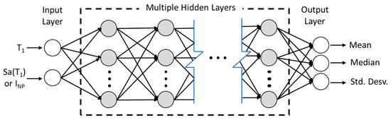 For the design of the architecture and the training process of the neural networks, the fundamental period and the ground motion intensity measure are the input variables, while the mean, median, and standard deviation of the maximum interstory drift are the output variables. Figure 7 shows the generic neural network architecture with multi-hidden layers, two neuron inputs, and tree neuron output. The input variables describe, in very general terms, the characteristics of the problems, because the fundamental period is one of the most important structural characteristics, and the seismic intensity measure describes the earthquake hazard using a simple value. Other seismic and structural features could be used as inputs to simplify the learning process; however, the deep neural network approach suggests modeling complex data using few inputs from multiple hidden layers between the input and output layers, hence the name “deep” networks. The output variables correspond to statistical parameters, which characterize, in general terms, the behavior of the maximum interstory response of RC mid-rise buildings under earthquake ground motions (Figure 8 and Figure 9). The mean and median are two statistical measures of central tendency that can be used to identify potential skewness in the distribution of data; that is, if the difference between the mean and median is high, it means that the data tend towards higher or lower values. The dataset of Figure 9 is in Appendix A.
