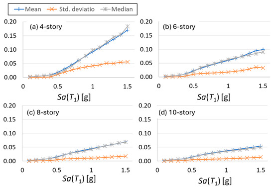 Mean, median, and standard deviation of the maximum interstory drift using spectral acceleration Sa(T1) for mid-rise with (a) 4 stories; (b) 6 stories; (c) 8 stories; (d) 10 stories.