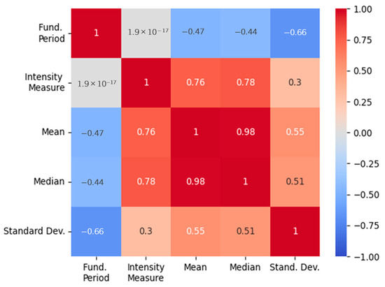 A correlation analysis between the input and output variables is presented in Figure 10. The mean, median, and standard deviation (outputs) have a moderate to significant or strong relationship with respect to the fundamental period and the intensity measure (inputs). Notice that, in Figure 10, no relationship between the input variables is observed, therefore, they were used as input neurons for the ANN model.