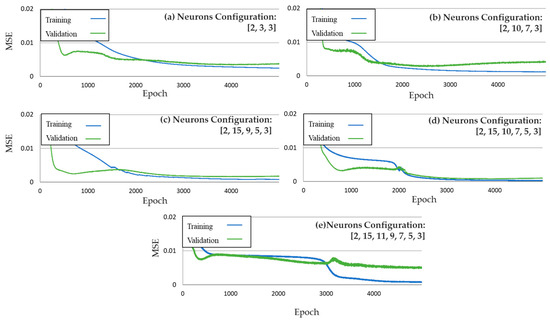 where is the normalized value, is the value to normalize, is the minimum value, and is the maximum value. Following the guidelines of good practice for the generation of models based on neural networks, the next stage is to partition the data. The separation of the data is carried out randomly under the following criteria: 70% for training and 30% for validating. The validation data are used to improve the evaluation of the model fit during the training process while the optimizer is running. The optimizer applied was the ADAM algorithm with MSE of loss function and a learning rate of 0.001 [47]. A small learning rate slows down the learning process but converges smoothly, while a large learning rate speeds up the learning but may not converge. Generally, a small learning rate is preferred. This optimizer method is based on the gradient descent approach, and, according to Kingma and Ba, the method is computationally efficient and is well suited for problems that are large in terms of data or parameters [47]. Furthermore, the MSE function is one of the most frequent loss functions used due to its continuity characteristic, which is very important when optimizers based on the descending gradient approach are used. This practice allows us to analyze the performance of the ANN due to unknown data which are not used for processing the network learning. In addition, the problem known as over-fitting can be determined with the help of an error behavior study. This problem appears when the neural network architecture is very complex for the purpose of simple tasks or when the interactive process of learning is too long [48].