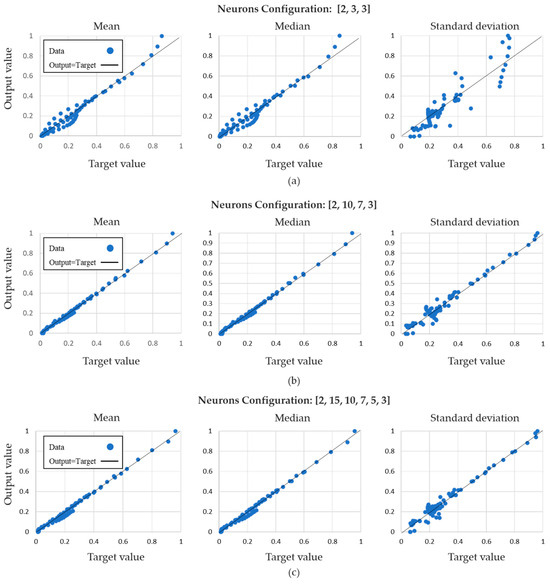 Relations between target values and output values due to a neural configuration: (a) [2, 3, 3]; (b) [2, 10, 7, 3]; (c) [2, 15, 10, 7, 5, 3].