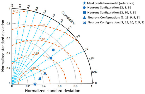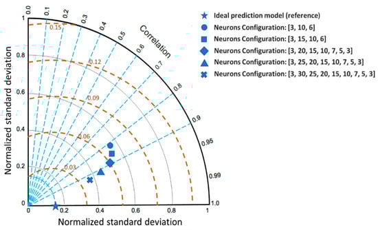 A graphic representation of the prediction performance of different models can be given from the well-known Taylor diagram, which is a visual aid to analyze and compare models from its three statistics attained: correlation coefficient, the root-mean-square error (RMSE), and the standard deviation [51]. Figure 13 shows a Taylor diagram with the prediction models of one, two, and four hidden layers. The brown circular dashed lines around the blue star (ideal prediction model) represent the error. The model with four hidden layers is the closest to the blue star; therefore, this model could be announced as the most accurate model because it has less error, higher correlation, and similar deviation.