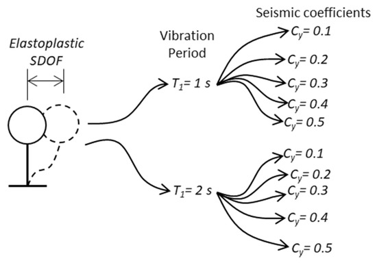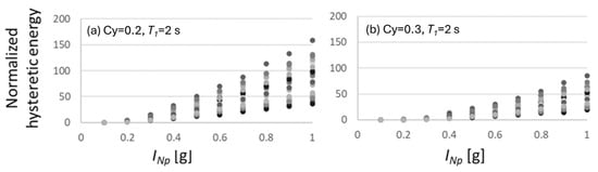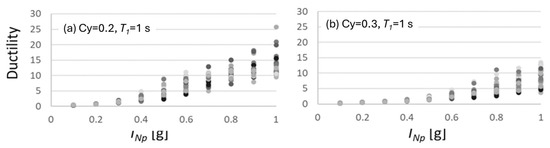 It is well known that the seismic performance of buildings is affected by many parameters like construction material, resisting system, etc. In the case of RC, BRBs frames, or most of the structural systems, the response prediction is very complicated, and the results can vary significantly. For this reason, all the seismic design codes around the world present earthquake-resistant methodologies, earthquake design spectra, record selection strategies for nonlinear dynamic analysis, ductility reduction factors, hazard analysis, and so on, based mainly on simplified models of the common, well-known single degree of freedom systems as the core of earthquake engineering. Motivated by this issue, thousands of nonlinear seismic analyses of various elastoplastic SDOF systems with different structural and in general dynamic characteristics (structural periods T, and seismic coefficients Cy), as those indicated in Figure 16, are obtained by using incremental dynamic analyses in terms of the novel and efficient intensity measure INp. Notice that, in this case, the new structural response parameters, ductility, and normalized hysteretic energy (the ratio of the hysteretic energy divided by the force and displacement at yielding), have been incorporated and calibrated via deep learning. These parameters have been selected since the ductility parameter is crucial in the international building codes; in fact, the ductility reduction factors usually selected to take into account the nonlinear behavior are based on the ductility [52,53,54]. The third parameter selected for this study was hysteretic energy, which is currently the most important parameter to account for cumulative demands on the structural design of buildings under earthquakes [55,56,57]. It is important to say that most of the new energy-based procedures and damage indices are based on hysteretic energy [58,59,60,61,62,63]. As an example, and for the sake of brevity, only the results of the incremental dynamic analyses of nonlinear systems with a period equal to one are presented for seismic coefficients of 0.2 and 0.3 in terms of ductility and in terms of normalized hysteretic energy demands, and for a period equal to two and for seismic coefficients of 0.2 and 0.3 (see Figure 17 and Figure 18).