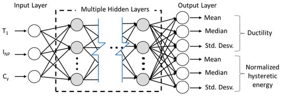 To analyze the performance of the approach presented via deep learning to predict the new parameters, the results obtained for ductility and normalized hysteretic energy are presented below. Figure 19 shows the configuration adopted in terms of input and output layers. Due to the large increase in outputs, it has been considered to add an important input (seismic coefficient Cy, one of the key parameters for earthquake-resistant design of buildings) to properly relate the problem with the new output parameters.