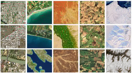 For this study, we have created a new dataset specially optimized for GAN training. Firstly, we collected images portraying various locations from across the globe, categorized into cities, coastal areas, deserts, lowlands, and tundras from the Copernicus Data Space Ecosystem []. Figure 1 displays sample satellite images for each category. This diversity ensures that the GAN learns to generate a wide range of synthetic satellite images with different features of terrain, vegetation, or human settlements.