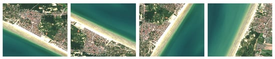 After acquiring the slices, it is crucial to carefully review and select the proper ones to be used for GAN training. As satellite images often contain disturbances such as distortion, unwanted objects, clouds, inadequate lighting, and other factors that impair image quality, including such images can cause the model to learn to reproduce these disturbances instead of focusing on the key features and details that need to be generated. Finally, after the cleaning, we acquired 50,000 slices of satellite images in PNG format. Additionally, to increase the dataset’s scope, 90° rotations and vertical and horizontal mirroring were applied to the collected images. Several examples of such transformations are shown in Figure 3.