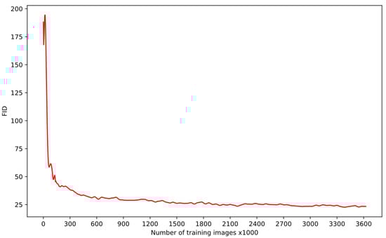 While training a GAN, monitoring the progress and quality of the generated images is critical. In addition to visual inspection by the human eye, specific metrics can be used to evaluate the quality of GAN-generated images. For this purpose, we used Fréchet Inception Distance (FID) [] for assessing the quality of images produced by the model. It is a valuable tool for determining the similarity between generated and real images. FID measures the similarity between the features of generated and actual images, and it is defined as