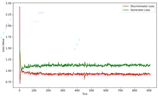 In Figure 5, the fluctuations in loss values for both the generator (represented by the green line) and the discriminator (illustrated by the red line) during the training of the model are visualized. The x-axis denotes the number of ticks from 0 to 900, while the y-axis represents the corresponding loss values. At the outset of the training, both the generator’s and the discriminator’s loss values are notably high and exhibit oscillatory behavior. However, as the training progresses, the losses for both components gradually diminish and stabilize. Although oscillations persist, their amplitude decreases. No singular dominance between the two components is evident. It is worth noting that the discriminator consistently exhibits lower loss values compared to the generator, which is a common characteristic in GANs, reflecting the initial ease with which the discriminator can distinguish real from generated images.