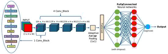 Features are extracted in the network through four convolutional blocks, progressively increasing the number of filters (64, 128, 256, and 512) to capture more abstract and higher-level features at deeper layers. An Adaptive Average Pooling layer follows the final convolutional block, reducing each feature map to a size of , thus converting the spatial dimensions into a single vector representation. This vector is then input into a fully connected neural network comprising two hidden layers, each with 512 neurons. To further mitigate overfitting and boost the network’s ability to generalize, dropout is applied between the fully connected layers. The output layer employs a sigmoid activation function suited for binary classification tasks by producing a probability score for each class.