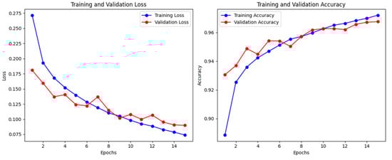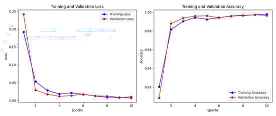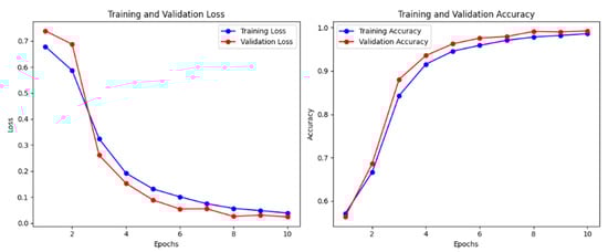 Interestingly, on the StyleGANv3 dataset, the validation set achieves better performance than the training set, as shown in Figure 9. This phenomenon can be attributed to the application of regularization techniques such as dropout layers in the network architecture. Dropout layers randomly turn off a certain percentage of neurons during the training process, thereby reducing the possibility of overfitting the model to the training data and improving the ability to generalize to unseen examples []. When we train it for another five epochs, the accuracy of the training set surpasses that of the validation set, which starts to decrease, indicating that 10 epochs is sufficient for optimal training. Moreover, the average results achieved on the test sets were 98.69% accuracy, 98.31% precision, 99.11% recall, and an F1 measure of 98.70%. Both precision and recall are very high and balanced, indicating that the model makes very few false positive (FP) and false negative (FN) errors. In other words, when the model predicts that an image is AI-generated, it is correct in 98.31% of the samples.