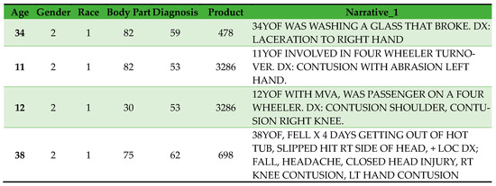 Injury narratives from the National Electronic Surveillance System (NEISS) [2], leveraging their concise and unstructured format, were utilized. The NEISS is an informative dataset managed by the U.S. Consumer Product Safety Commission (CPSC). The system collects data from over 100 hospitals across various healthcare settings, ensuring data representation and an accurate scale to reflect nationwide trends. NEISS is a critical tool for acquiring and assessing information about injuries, including those brought on by defective consumer goods, adverse drug events, and acts of violence. Preventive initiatives, product recalls, and public safety regulations have benefited from the use of NEISS data. The nationally representative hospitals in the United States and its territories feed the data into NEISS. Every ER visit associated with a consumer product or a kid under five years old’s poisoning is reported by each member of the NEISS facility [2]. This dataset holds crucial data elements essential for understanding consumer product-related injury dynamics. It offers a demographic profile of those most affected by specific injuries, detailing the age, sex, race, and ethnicity of the injured. The data include detailed injury information, such as descriptions, affected body areas, diagnoses, and outcomes (treated and released or hospitalized), alongside product data highlighting potential risks and identifying involved consumer products. The data used for this research included detailed injury information, such as descriptions, affected body areas, diagnoses, and outcomes, alongside product data highlighting potential risks and identifying involved consumer products.