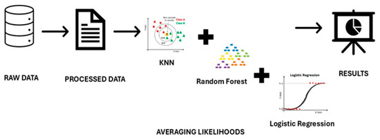 Different ensemble models that integrated the predictive capabilities of the LR, KNN, and RF [17] were developed. The ensemble approach combined the advantageous properties of classifiers into a framework to enhance prediction precision and reliability. The four ensemble models developed were as follows: the KNN + LR model, the KNN + RF model, the RF + LR model, and the KNN + LR + RF model. Combining KNN with LR, we leveraged KNN’s ability to capture the nuances of local data structures and LR’s powerful probabilistic classification ability. Similarly, making use of RF’s strength to handle complex data interconnections and high dimensionality, with KNN’s locality-based insights, the number of misclassifications by the individual models were minimized [18].