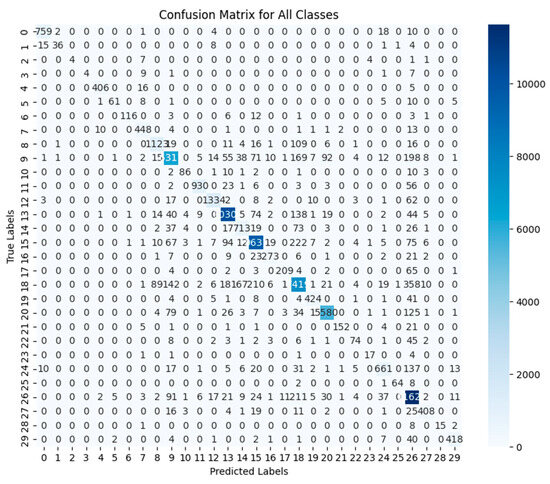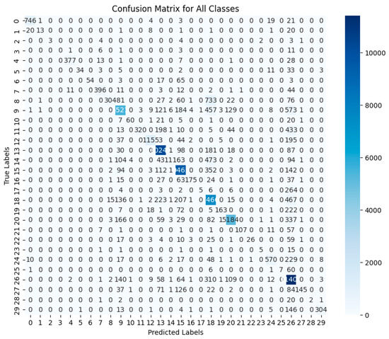 The detailed performance of the LR model for each category is shown as a confusion matrix in Figure 3. It depicts the LR model’s performance in multi-class variation, highlighting the model’s challenges in correctly classifying complex data due to high prediction errors and misclassifications. The results indicate that using a single model, such as LR, is ineffective for handling complex datasets, thus necessitating the need for ensemble models, which combine the strengths and capabilities of multiple algorithms to improve prediction accuracy and reduce errors.