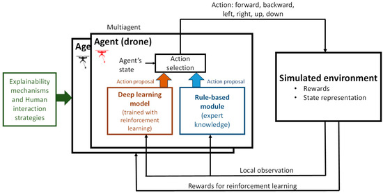 This paper describes the development and evaluation of hybrid artificial intelligence strategies for drone navigation in simulated environments. The hybrid AI combines deep learning models with rule-based strategies to generate the agent action based on the agent state. The system has a high level of configurability to adjust the scenario difficulty, including a different number of targets or obstacles. This tool incorporates explainable strategies for analyzing agent decisions and human interaction facilities for correcting or modifying agents’ behaviors by a human operator.