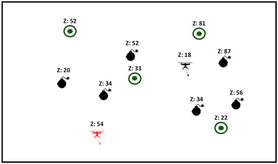 - For the drone observation space, the same observation space used for the previous scenario (reaching targets) has been considered: a 20 × 20 submatrix of the state space, centered in the agent, including for each cell the reward that the agent would obtain moving to this point (−1.0 values are assigned to forbidden areas, scene, and object margins). In this case, the first detected target is the reference to compute the agent−target distances. In the case of having several detected targets in the same zone, the reference for computing the distance is the average target position.