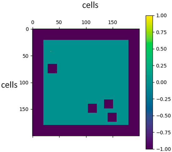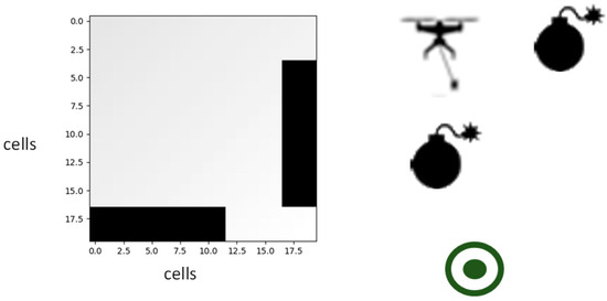 The 2D environment state space is represented as a 200 × 200 matrix with different values per cell: −1.0 values are assigned to forbidden areas (obstacles and game margins to avoid collisions) (Figure 3). In the case of a 3D environment, the environment state space is a 3D matrix.