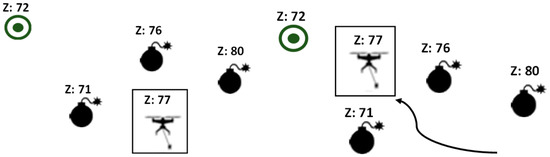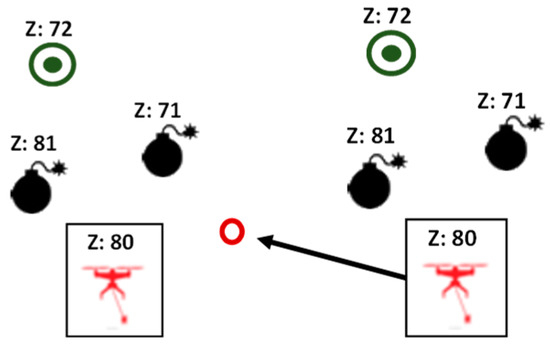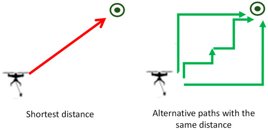 - The second alternative consists of redefining the distance between the agent and the target to allow several possible paths with the same distance, not only one. The way to consider several paths with the same distance is by computing the distance by summing vertical and horizontal movements uniquely, as shown in Figure 4. As shown in this figure (right side), there are several paths with the same distance. This solution increases the agent’s flexibility to avoid obstacles. But this flexibility was not enough, and it did not solve all the cases to avoid obstacles; when the drone movement must be horizontal or vertical, the flexibility disappears. Because of this, it was necessary to implement a specific strategy (based on rules) to avoid obstacles (Section 3.2.1).