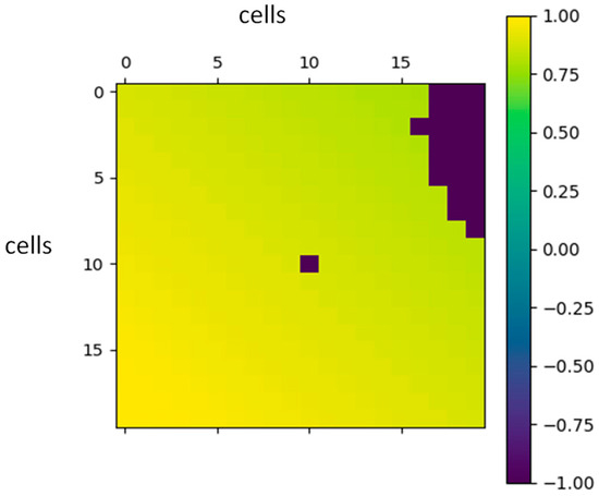 The main target of this module is to define the next action according to the drone navigation policy. The next drone action is selected from the rule-based module or from the deep learning model depending on the drone state and the local observation of this drone. The local observation of a drone is represented by a 20 × 20 submatrix of the state space (the number of 2D or 3D dimensions depends on the scenario), centered in the agent (Figure 5). Every cell in this matrix includes the reward that the agent would obtain if moving to this point: −1.0 values are assigned to forbidden areas (margins and obstacles). In this figure, the center is marked with a −1.0 (only for representation).
