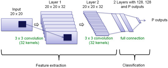 - A fully connected network that maps the features to actions, including two fully connected layers with 128 neurons each and a final layer with P outputs and the Softmax function (classification). The number of outputs is 6 (forward, backward, left, right, up, down) or 4 for 2D scenarios (forward, backward, left, right).