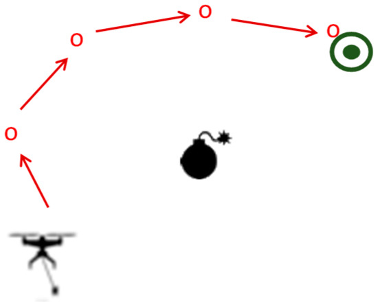 The process starts when an obstacle is detected between the agent and the target, and the drone is not able to find an alternative path without obstacles (Figure 8). In this situation, the system modifies the agent’s target, situating a fictitious target to a certain angle with respect to the line connecting the agent and target. Once the agent reaches the fictitious target, a new real target is assigned (in the circumference centered in the obstacle), and the process starts again. This process can be repeated several times until the agent is able to find a free path to the real target. The next figure shows an example of the path followed by the drone to avoid obstacles by reaching intermediate fictitious targets.