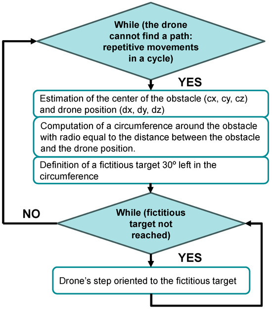 Although a new distance was defined to provide certain flexibility to the drone path, there are situations where the drone cannot find an alternative path without obstacles. These cases are automatically detected by the drone when the drone repeats several movements in a cycle without decreasing the distance to the target. In this circumstance, the drone understands that it was not able to find an alternative path without obstacles and starts executing the avoiding strategy based on rules. In this state, the agent is forced to go around the obstacle, describing a circumference as shown in Figure 7. This behavior is provoked by changing the agent target; the system generates a sequence of fictitious targets that go around the obstacle.