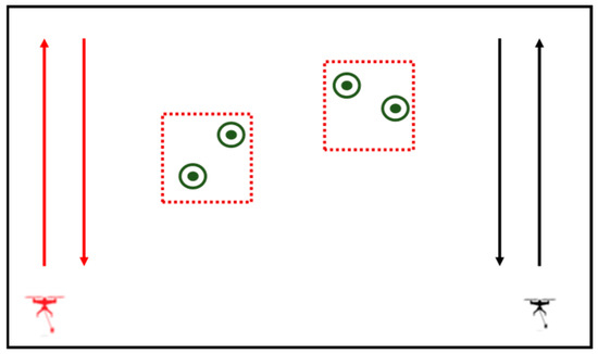 All the agents (drones) start doing an exhaustive search. The navigation is guided by a rule-based module. During the exhaustive search, the drone movements are defined by a set of expert rules (Figure 9), trying to cover the whole environment in vertical paths like in Figure 10.