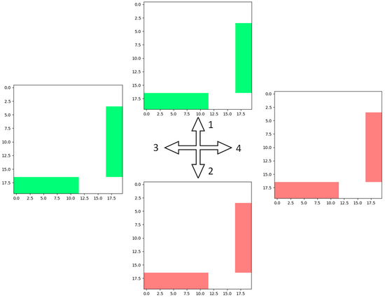Figure 12 represents the contribution of each pixel/cell in the local observation space for each action. In this case, there are four actions in a 2D environment: 1 (forward), 2 (backward), 3 (left), and 4 (right). As shown, the obstacles in the left and bottom part are suggesting that the best actions (more green pixels with positive impacts) are 1 and 3.