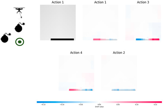 Additionally, the study also includes an analysis using SHAP to obtain more details about the explainability of the decisions made by the agents/drones. This method is based on game theory and uses Shapley values to compute contributions to each feature in the prediction of a model. These features are pixels when analyzing an image.