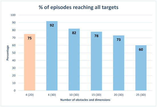 - As shown, when adding the third dimension (Z coordinate) with only four obstacles, the results on the percentage of episodes reaching all targets improves, reaching a very good value. This value (around 92%) is difficult to improve because, as targets and obstacles are situated randomly, there is always the possibility to have a target situated in the security zone of an obstacle and it cannot be reached.