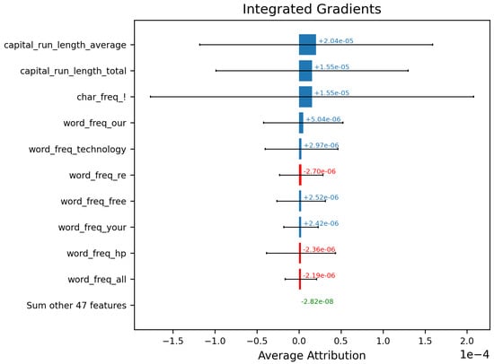 Average attribution plots created by SIBILA. Integrated gradients attributions obtained for the ANN model after training the spam dataset.