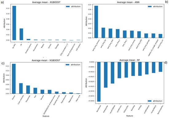 The second experiment involves identifying the most relevant features for the models to make decisions. Figure 7 shows the top-10 attributed features after the data fusion. Our consensus function, the average mean, detects an evident influence of the “Dx:HPV” feature when explaining the XGB model for the cancer dataset. The HPV test examines cells to find infections with the high-risk types of HPV that sometimes cause cervical cancer. It is recommended every five years starting at age 30. Hence, it seems logical to consider it a relevant biomarker for our model. Concerning the spam dataset, the ANN model focuses on the appearance of the word “remove” so that an email containing this word frequently should be tagged as spam. Although this is the best discriminant, other words like “hp” and “free” or the character “$” could also serve to classify an email as spam. Again, the explanation of this model makes sense because the word “remove” could appear once or twice but not several times in an email. The explanation of the wine dataset targets “proline” as the most relevant feature. It has been proven that proline concentration in grapes is related to maturity and cannot be exploited by yeasts; as such, its concentration can be managed through specific viticultural practices. On the other hand, proline is easy to determine in wine and could be used to identify desirable sensory profiles []. Finally, the regression with the crime dataset was the hardest to explain because all the features received similar attention, and almost all were negatively attributed. The negative attribution values mean that the higher the feature values, the lower the probability of classifying the sample as the predicted class. SIBILA sorts the features by the absolute value of their attributions; thus, the most important ones may not be aligned with the highest attributions. Although the attributions were very similar, “NumStreet” received more attention than others. The negative importance of NumStreet indicates that this feature is associated with a reduction in the crime rate, i.e., the higher the number, the lower the crime rate. If a community has more streets, it could be interpreted as having better infrastructure, greater connectivity, or being better developed. This could correlate with lower crime rates, as indicated by the model. On the contrary, the features with the highest positive attribution were “community” and “county”, which indicates that specific communities and certain counties are more prone to high crime rates.