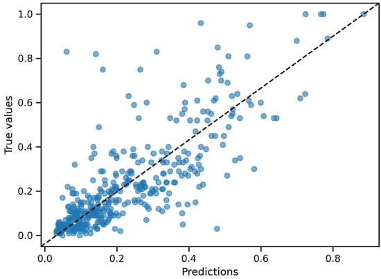 SIBILA has been benchmarked in three different tasks with four toy datasets. The primary purpose of SIBILA is to search for ML and DL models for a given dataset. In this regard, a complete search was performed across all the available models and three types of problem. The first search was carried out with the cervical cancer dataset. Some models, such as XGB, reached the maximum accuracy (AUC = 1). This test proved SIBILA to be helpful in binary classification tasks. However, the unusually high scores obtained for many of the models may indicate that cervical cancer is a too-simple dataset. Hence, another binary classification task was carried out with the spam classifier dataset. This dataset is bigger than the previous one (4601 samples and 57 features), but the accuracy of the models is also very high. The chosen model was the deep-learning approach (ANN) in this case. Although the ML models also reached high accuracy, the ANN model outperformed them. This may be due to the complexity of the data that makes the DL approach better than other simpler models. Regarding the multiclass classification task, the preferred model was again XGB. However, the accuracy was much lower than in binary classification (AUC = 0.536). The poor accuracy of the model suggests two improvements: (i) Pre-processing the data with more techniques (handle outliers, standardization…), (ii) training the models with advanced options like cross-validation and class weighting. In any case, XGB seems to be a good choice as a baseline. The last task was to predict the number of crimes in different cities in the USA. The suggested model was RF, which is an ensemble model. The metrics obtained for this model were acceptable (MAE = 0.087, MSE = 0.018), but the coefficient of determination was not so high ( = 0.628). is a correlation metric that indicates if there is a linear relationship between the inputs and the target feature. The obtained value suggests a slight correlation, which is confirmed by the plot created by SIBILA (Figure 9).