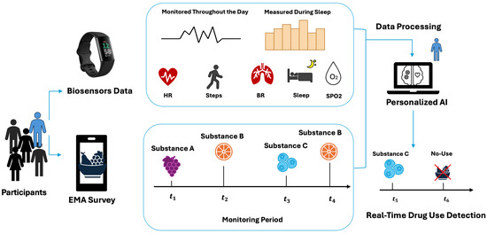 This pilot feasibility study aimed to utilize wearable Fitbit sensors combined with machine learning to predict real-time drug use (Figure 1). We collected data from 9 participants recruited through two local programs in Hawaii: a harm reduction outreach initiative and a substance use treatment facility. We also recruited broadly at the University of Hawaii, including both students and staff. We equipped all participants with Fitbit devices that continuously monitored heart rate (HR) and step count during waking hours as well as breathing rate (BR), steps, sleep quality, and blood oxygen saturation () during sleep. Alongside biosensor data, we asked the participants to complete EMA surveys 4 times a day to provide labels of substance use and cravings. We trained personalized AI models to predict real-time drug use from a 1 h time window of Fitbit data.
